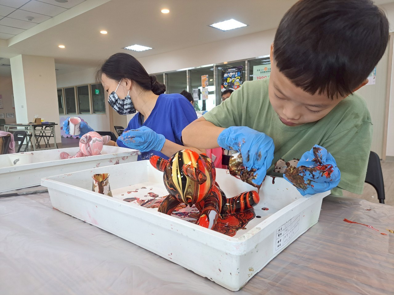 圖二 : 在老師的引導下,多彩的顏料在小熊上緩慢流動、逐漸形成獨一無二的作品。